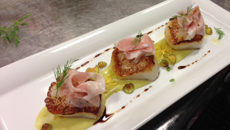 Scottare le capesante. Sul piatto di portata adagiare prima la scarola alla griglia, poi la crema di scarola, le capesante e la spuma di curry. Coprire con la pancetta cotta Collinetta.