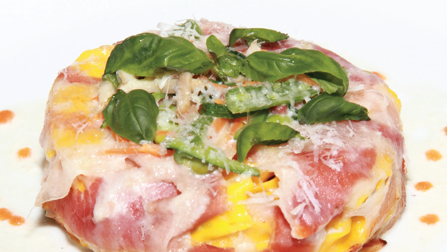 Cuocere le tagliatelle in abbondante acqua salata, scolare e condire con le verdure assieme alla besciamella, i dadini croccanti di Collinetta, il Parmigiano e amalgamare tutto. Verificare il sapore e distribuire il composto negli stampi con Ia Collinetta cercando di schiacciare leggermente, cospargere con un po’ di parmigiano e una noce di burro, mettere in forno già caldo a 180° per 5 minuti. Sfornare in una fondina le tagliatelle; grattugiare al momento un po’ di Parmigiano Reggiano e servire decorando con dei ciuffi di basilico e un filo di olio extravergine.