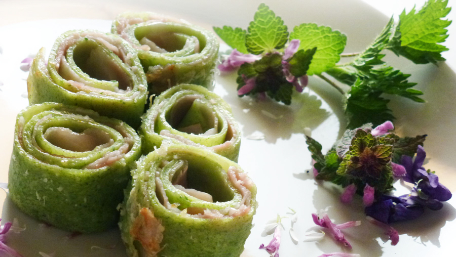 Preparare le crèpes (se ne otterranno da 4 a 6 pezzi) amalgamando con una frusta le uova alla farina e al sale, entrambi setacciati, unire le ortiche e il burro liquefatto nel padellino che si vorrà utilizzare per cuocere le crèpes. Adagiare 3 fette di Collinetta Marco d’Oggiono in ogni crèpe e il formaggio tagliato a bastoncino in modo tale che venga subito inglobato nella crèpe man mano che la si arrotola.