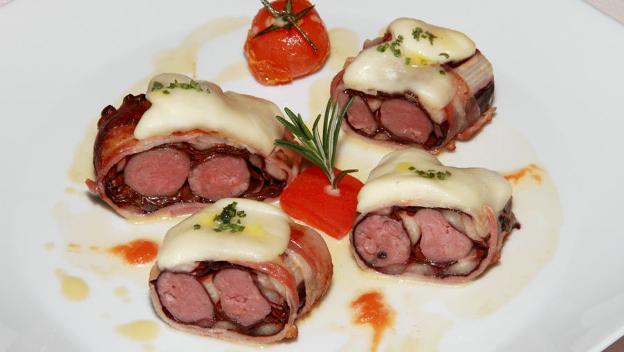Lavare e asciugare i cespi di trevigiana, aprirli delicatamente e sistemare all’interno di ognuno una salamella, avvolgere il tutto e chiudere con le fette di bacon.